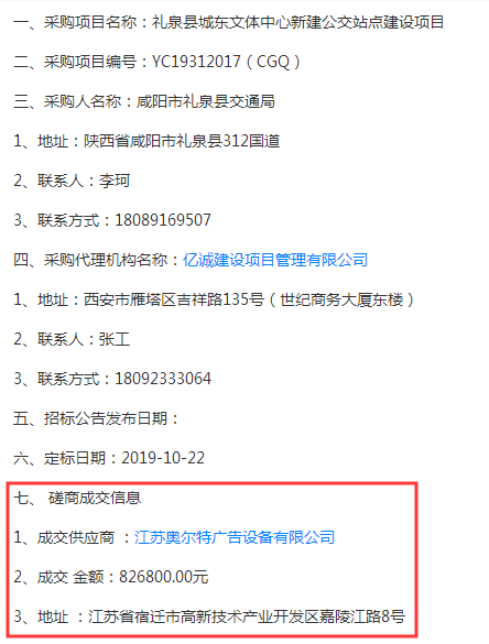 根據(jù) 磋商小組 的評審結(jié)論和采購人 “成交復(fù)函” ,現(xiàn)將 磋商成交 結(jié)果公告如下:江蘇奧爾特廣告設(shè)備有限公司成功中標(biāo)。中標(biāo)金額為826800.00元(人民幣)