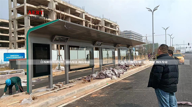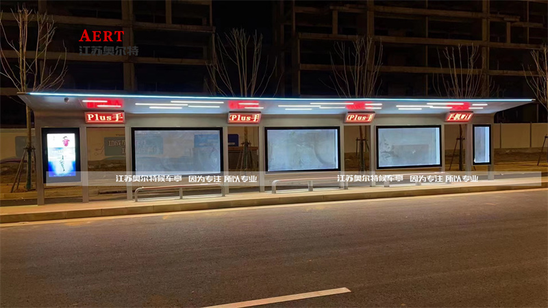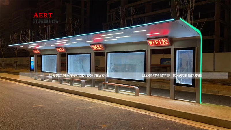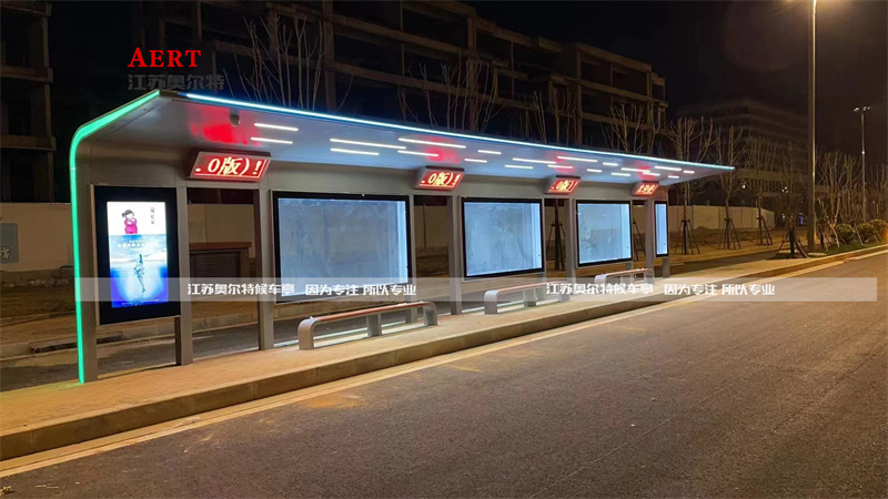 此次公交候車亭是給江西南昌城市改建制作的新款公交站臺(tái),站臺(tái)整體配置55寸電子站牌智能語音報(bào)站功能,實(shí)時(shí)監(jiān)控?cái)z像頭,頂棚四周采用綠色氛圍燈夜晚效果非常的高端大氣!